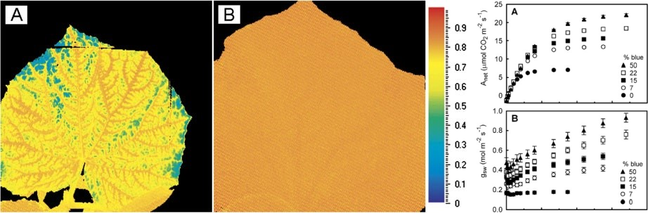 左圖A為100%紅色光源條件下黃瓜葉片的Fv/Fm,左圖B為30%藍色光源條件下黃瓜葉片的Fv/Fm;右上圖為光合作用強度隨光照強度(不同比例藍色光)的關(guān)系,右下圖為氣孔導(dǎo)度隨光照強度(不同比例藍色光)的關(guān)系