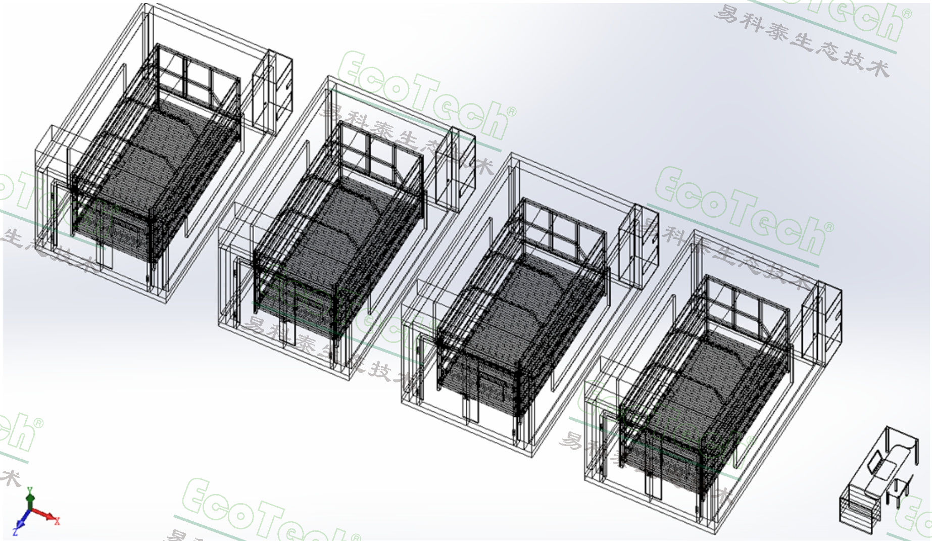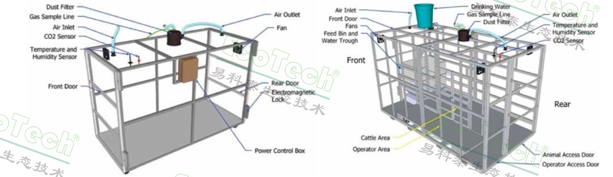左圖為小型代謝艙設(shè)計(jì)示意圖,適于小牛犢及成體羊等;右圖為中大型代謝艙設(shè)計(jì)示意圖(僅供參考,實(shí)際代謝艙設(shè)計(jì)根據(jù)現(xiàn)場(chǎng)考察定制)