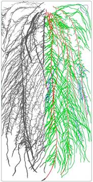 11)根系拓?fù)?/span>(Topology)分析(專(zhuān)業(yè)版RGB掃描分析軟件):連接數(shù)量、路徑長(zhǎng)度等研究(需要根系完整)(必須是要完整的根系掃描圖像。軟件可計(jì)算主根的長(zhǎng)度、所有次級(jí)根的總長(zhǎng)度、平均長(zhǎng)度、平均直徑、平均表面積;每一級(jí)分叉的下級(jí)總分叉數(shù)量;每一級(jí)分叉的總數(shù)量等)