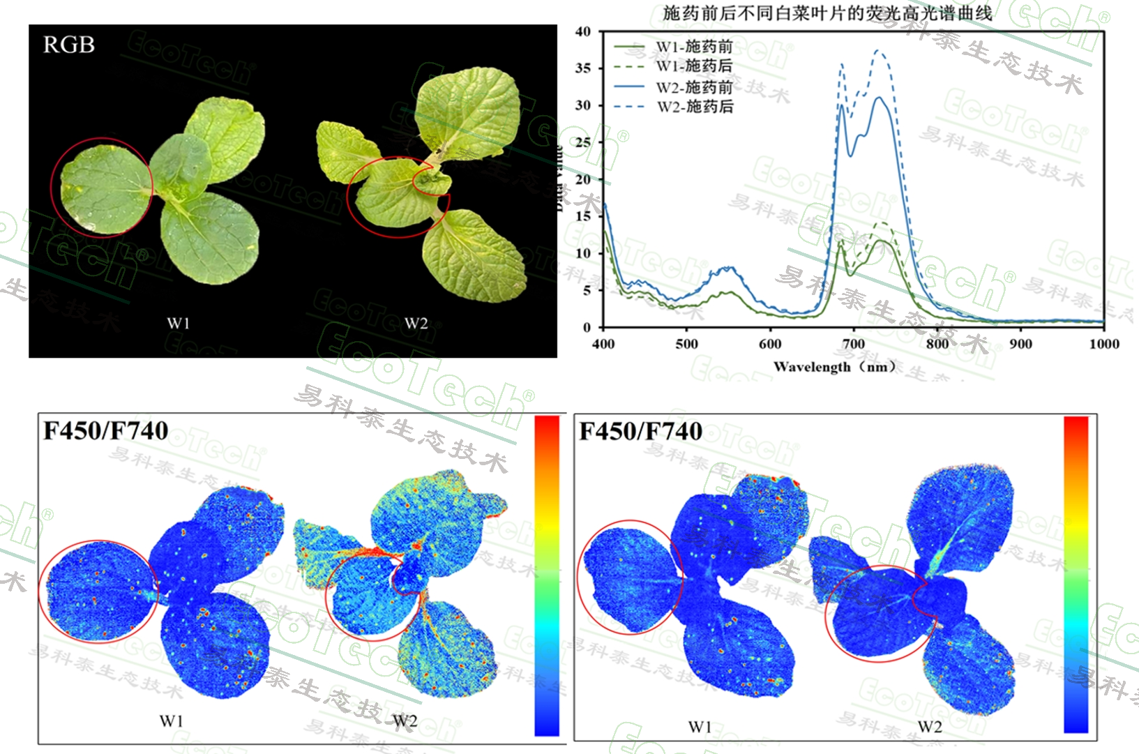 白菜苗的靶向農(nóng)藥篩選:上左圖:培養(yǎng)平臺上下兩層感染蚜蟲白菜苗RGB圖(W1上層,W2下層),紅圈部位為施藥葉片,其余為對照葉片;上右圖:W1、W2葉片施加吡蟲啉前后的熒光光譜;下圖: W1、W2葉片施藥前后F450/F740比值圖對比(左施藥前,右施藥后);施藥后葉片葉綠素熒光值升高,比值指數(shù)降低,蚜蟲導致的紅色斑點減少,說明吡蟲啉可有效祛除蚜蟲,且不會對植物造成不良影響(EcoTech®實驗室提供)