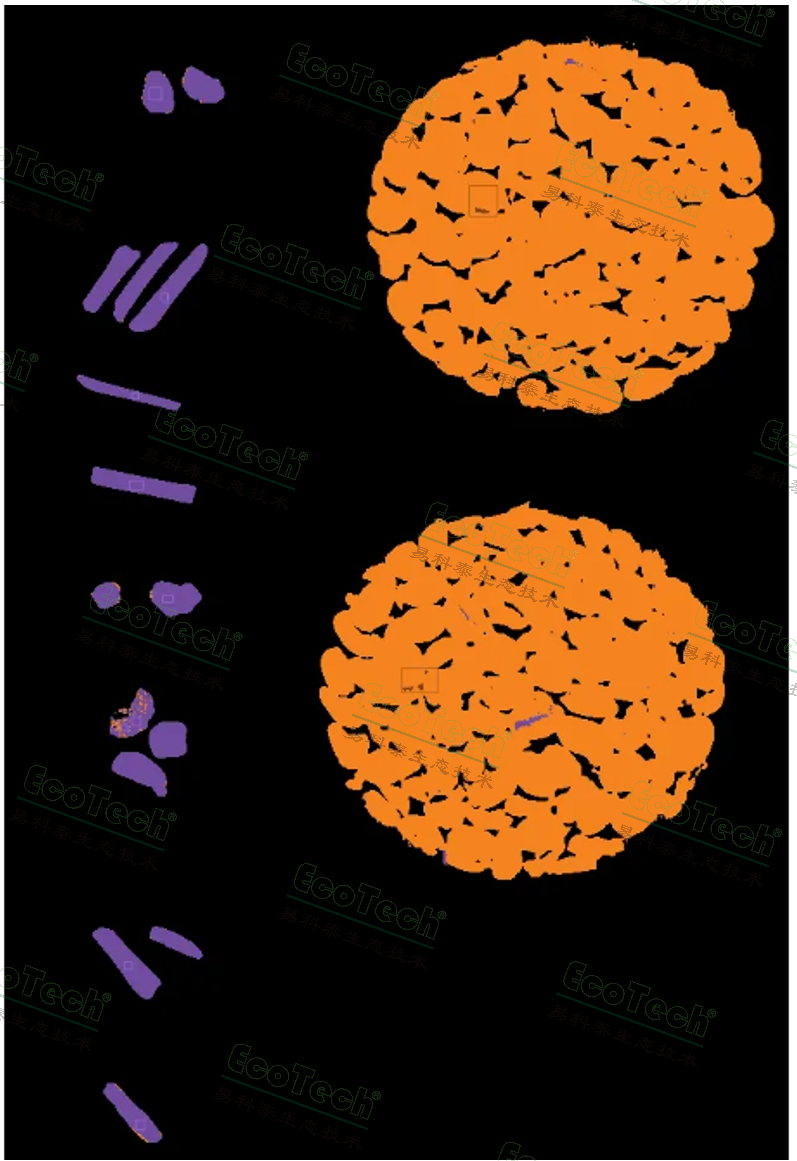 圖4:基于Specim FX17相關(guān)模型的預(yù)測結(jié)果(啡豆為橙色,污染物為紫色)