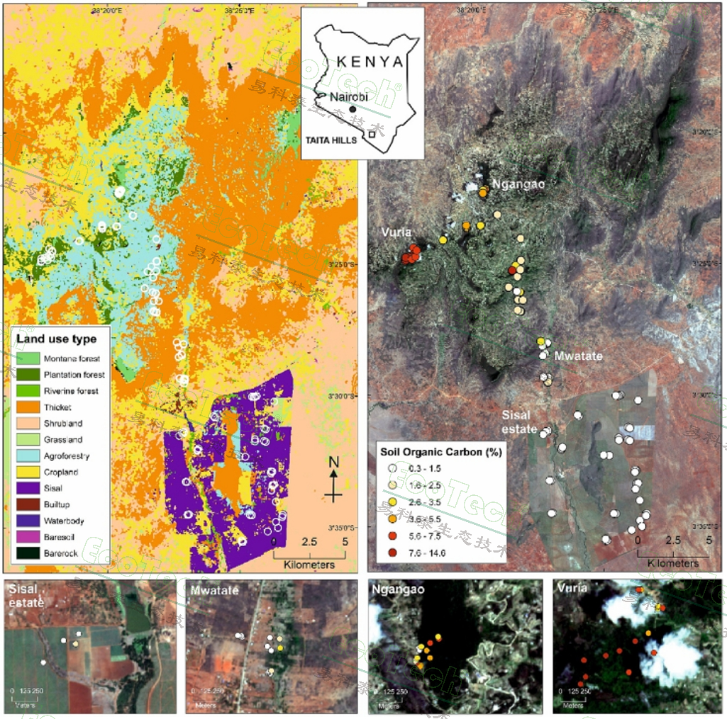 圖1:本研究的土壤采樣點(diǎn)繪制在肯尼亞泰塔山的土地利用圖(左上),經(jīng)實(shí)驗(yàn)室分析的不同海拔高度(800-2200m)的土壤樣的地理位置及SOC含量(右上,下圖為局部放大圖)