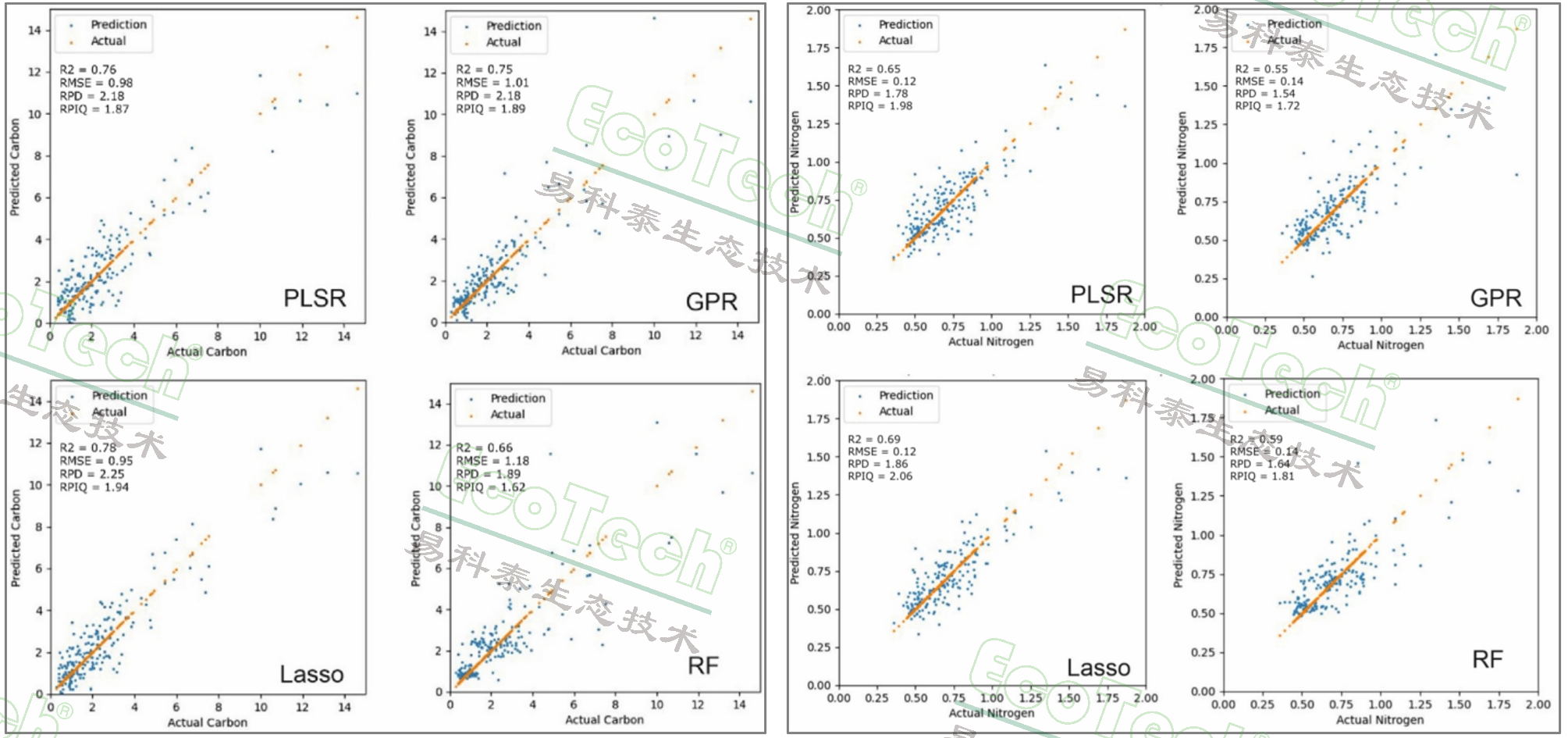 圖3:使用多種回歸算法(PLSR、GPR、LR和RF)對(duì)土壤樣本中SOC(左)和氮含量(右)的回歸分析