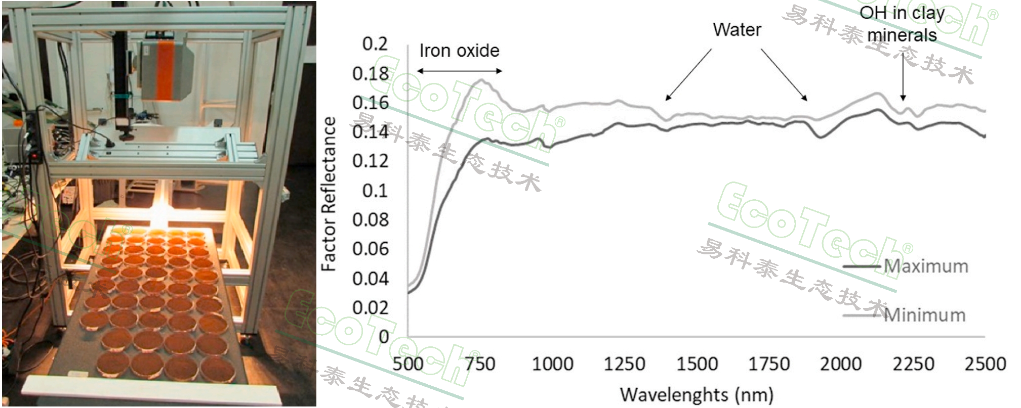 圖4:高光譜成像掃描平臺(tái)(左)及具不同SOM含量的土壤樣品反射光譜曲線