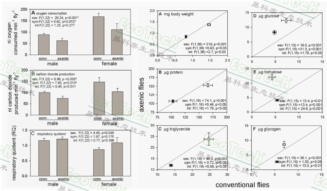 動(dòng)物常駐微生物群(尤其是腸道菌群)對(duì)宿主營(yíng)養(yǎng)加工、代謝信號(hào)及健康至關(guān)重要,但哺乳動(dòng)物菌群復(fù)雜(數(shù)百種,多不可培養(yǎng)),研究難度大。英國(guó)約克大學(xué)生物學(xué)系的研究團(tuán)隊(duì)以果蠅為樣品探究常駐微生物群對(duì)果蠅營(yíng)養(yǎng)表型(生長(zhǎng)、營(yíng)養(yǎng)狀態(tài)、代謝)的影響。其中無(wú)菌果蠅幼蟲(chóng)發(fā)育時(shí)間顯著延長(zhǎng),而存活率、成年體重、雌性產(chǎn)卵量無(wú)顯著差異。無(wú)菌果蠅的耗氧率和產(chǎn)CO?率顯著低于常規(guī)果蠅,雌性高于雄性;雌雄呼吸商均接近 1,表明主要呼吸燃料為葡萄糖。其中無(wú)菌果蠅幼蟲(chóng)發(fā)育延長(zhǎng)可能因微生物缺失導(dǎo)致?tīng)I(yíng)養(yǎng)獲取效率降低,而成年體型無(wú)差異說(shuō)明幼蟲(chóng)臨界體重后的生長(zhǎng)不受影響,提示微生物作用主要在臨界體重前階段。這表明果蠅常駐微生物群雖非生存必需,但通過(guò)促進(jìn)幼蟲(chóng)生長(zhǎng)、調(diào)節(jié)碳水化合物分配及能量穩(wěn)態(tài),顯著影響宿主營(yíng)養(yǎng)表型,揭示動(dòng)物營(yíng)養(yǎng)表型需結(jié)合宿主 - 微生物群相互作用機(jī)理。