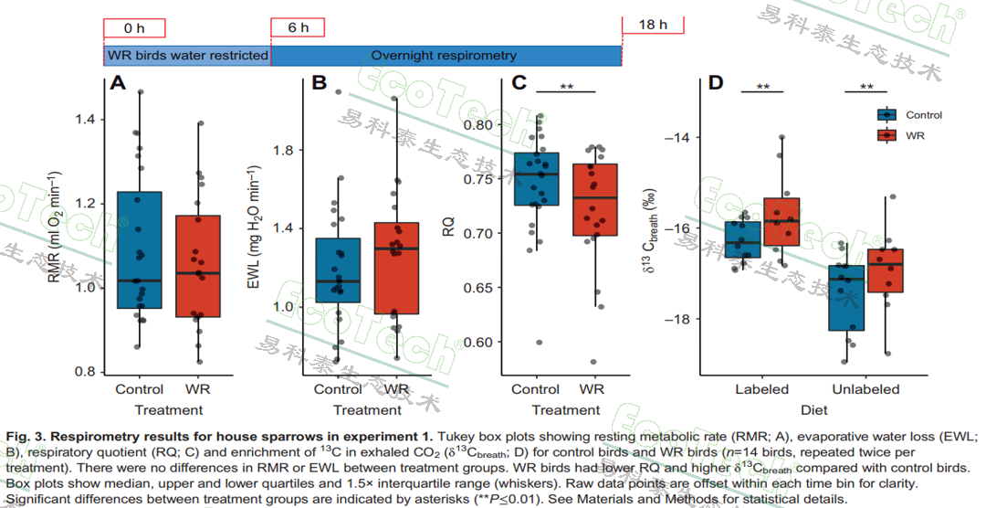 研究者給圈養(yǎng)的家麻雀喂食13C標記的亮氨酸9周,以標記內源性蛋白質。每周進行一次試驗,在此期間,測量了對限水的生理反應,如瘦體重、脂肪量、新陳代謝的變化以及呼出二氧化碳中13C 的富集(δ13Cbreath)。研究發(fā)現(xiàn),限水的鳥類分解代謝了更多的瘦肉組織,并且還富集了δ13Cbreath以響應限水。然而,δ13Cbreath隨代謝率和限水期的長短而變化,這表明當可以使用其它生理策略實現(xiàn)水分平衡時,鳥類可能會節(jié)省蛋白質。