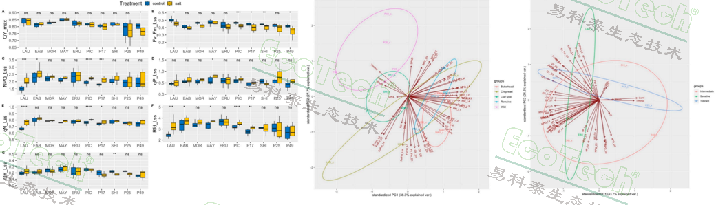 圖1. 左圖:不同基因型生菜樣品對鹽脅迫響應(yīng)的葉綠素?zé)晒鈪?shù)變化;中圖:不同生菜類型的 PCA 分析圖;右圖:鹽脅迫下基因型 PCA 分析圖;