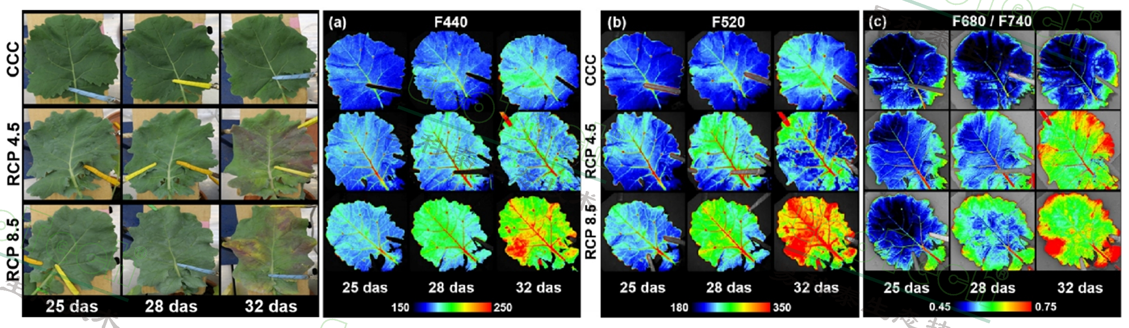 研究表明,在不同的代表性濃度路徑(RCP)情景下,油菜的生理指標(biāo)發(fā)生了顯著變化。RCP4.5下,第25天開始F440、F520高于對照,葉脈尤其明顯。但到第32天,F(xiàn)520與對照差異不明顯。RCP8.5下,F(xiàn)440、F520與對照有顯著差異。F680/F740與葉綠素含量成反比,對照處理期間無變化,處理組則有明顯升高,但到第32天兩個(gè)處理組基本一致。