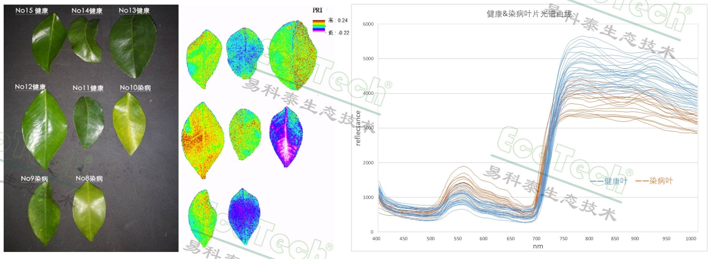 柑橘葉片黃龍病高光譜成像分析:PRI指數(shù)顯示染病葉片的光利用效率顯著降低(易科泰光譜成像實(shí)驗(yàn)室提供)