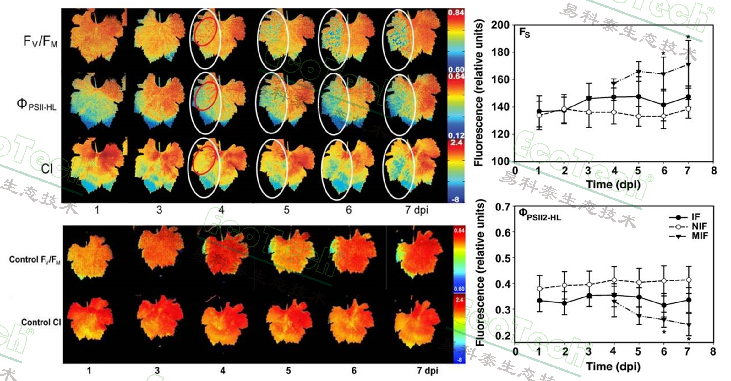 左圖:施藥組葉片(上)和對(duì)照組葉片(下)的葉綠素?zé)晒鈪?shù)隨時(shí)間的變化情況,光系統(tǒng)II的最大量子產(chǎn)率Fv/Fm、光系統(tǒng)II在高光化光下的有效量子產(chǎn)率 (ΦPSII-HL) 和葡萄藤葉片的組合成像參數(shù) (CI)。右圖:葉片部位的穩(wěn)態(tài)熒光Fs及ΦPSII-HL隨時(shí)間變化情況(IF表示被感染的半片葉子、NIF表示未被感染的半片葉子、MIF表示直接被感染的葉斑部分)(參考文獻(xiàn)Cséfalvay L, et al. Pre-symptomatic detection of Plasmopara viticola infection in grapevine leaves using chlorophyll fluorescence imaging[J].)