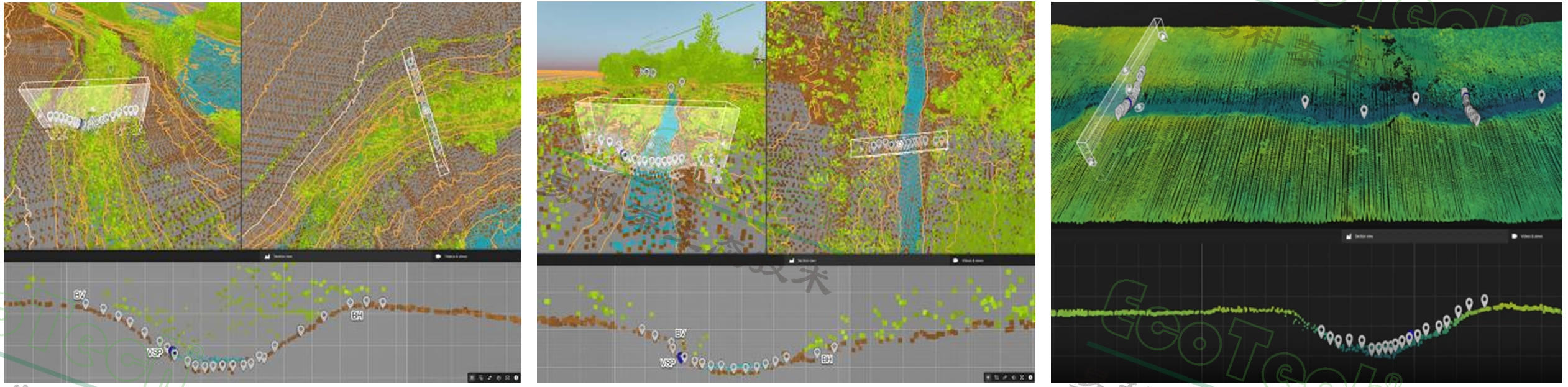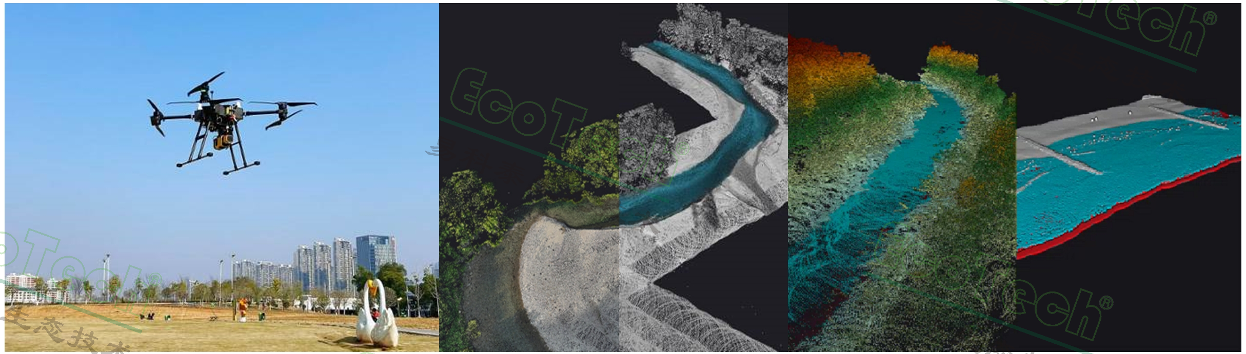 左圖:Ecodrone®激光雷達(dá)系統(tǒng);右圖:多類型水域環(huán)境的點(diǎn)云成像效果