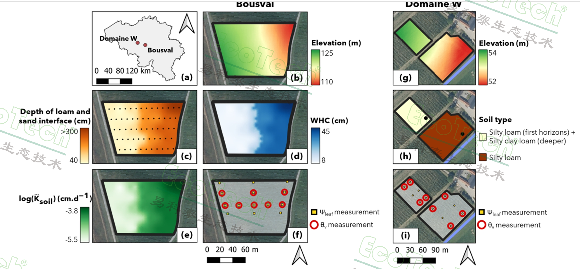 圖1:Bousval和Domaine W葡萄園的分布位置(a)、海拔高度(b、g)、土壤屬性(h)及葉片水勢(Ψleaf_meas)與體積含水量(θv)剖面測量點位分布(f、i):(c)壤土與砂質(zhì)底土層界面深度的克里金插值采樣點,(d)2.5米深度處的持水能力(WHC),(e)2.5米深度處平均土壤導(dǎo)水率