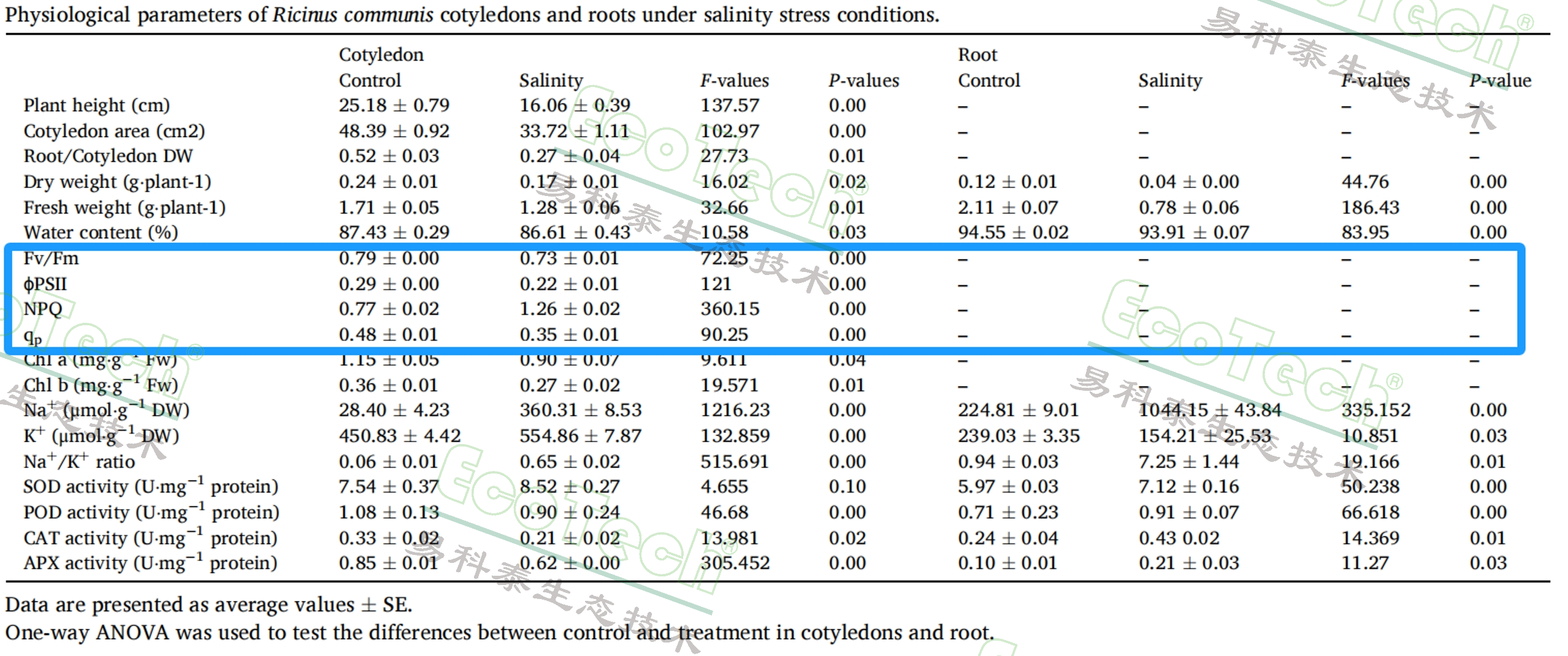 表:鹽脅迫條件下蓖麻子葉和根系的生理參數(shù)(其中框選部分為使用FluorCam葉綠素?zé)晒獬上瘾@得的光合參數(shù))
