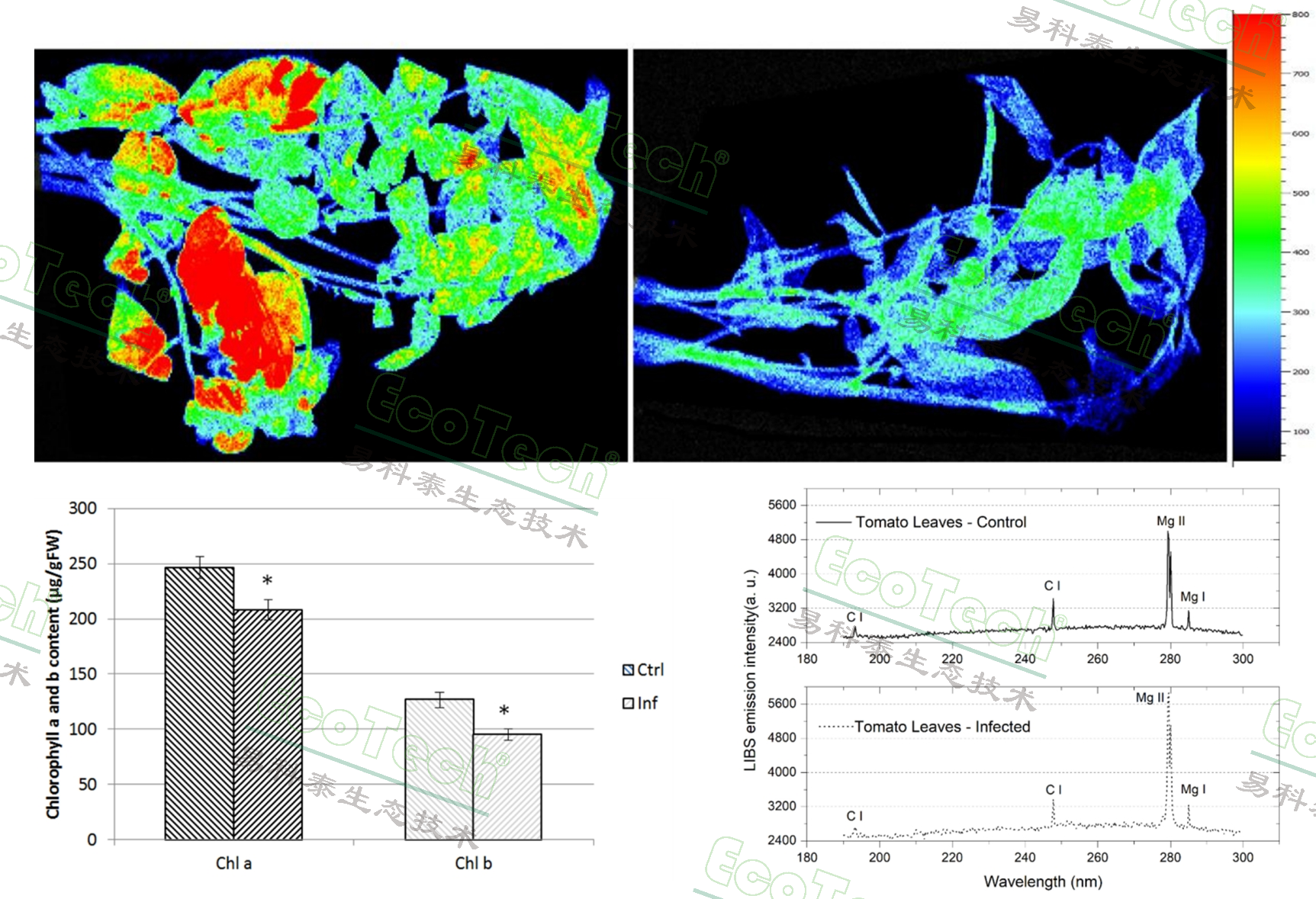 圖1. 上圖:感染根結線蟲的番茄葉片葉綠素熒光成像對比圖;左下圖:感染根結線蟲的番茄葉片葉綠素a和葉綠素b提取含量對比;右下圖:感染根結線蟲的番茄葉片的LIBS元素分析對比光譜