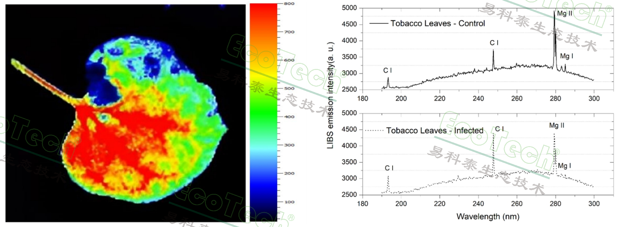 圖3. 左圖:感染建蘭花葉病毒的煙草葉片葉綠素熒光成像圖;右圖:感染建蘭花葉病毒的煙草葉片LIBS元素對比圖譜