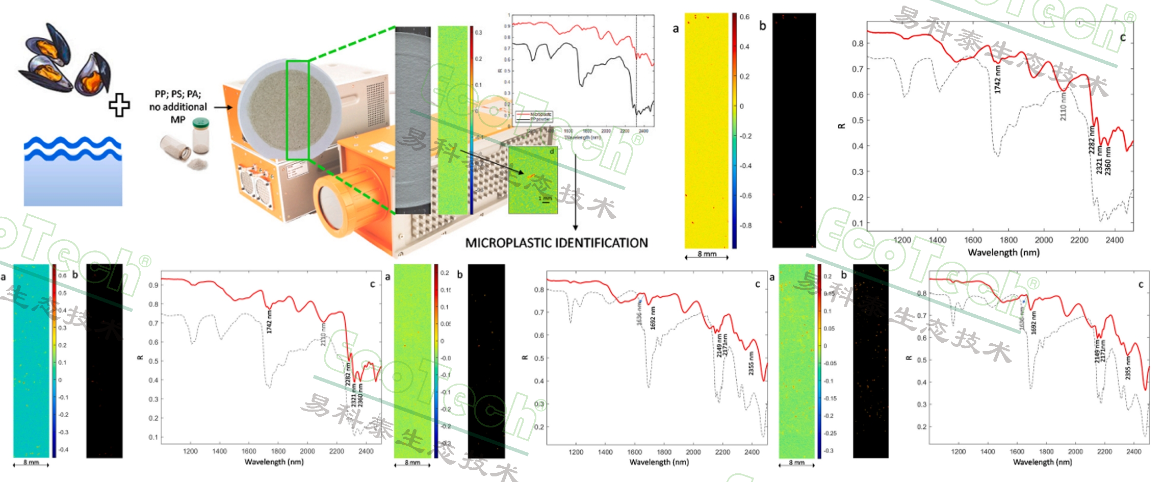 StefaniaPiarulli等人提出一種基于近紅外高光譜成像(NIR-HSI)結(jié)合歸一化差異圖像(NDI)策略的方法,用于檢測復(fù)雜水生環(huán)境中的微塑料??蒲腥藛T在意大利拉文納濱海地區(qū)采集海水樣本,包括添加不同含量PP、PS和PA微塑料的樣本以及未添加的真實海水樣本,檢測到了其中的微塑料,并分析了其聚合物類型。同時選擇了該地區(qū)的貽貝樣本,對其進行清洗、凈化、處理后添加微塑料,同時也對部分未凈化的真實貽貝樣本進行分析,發(fā)現(xiàn)不同樣本中的微塑料含量和檢測情況有所差異。實驗結(jié)果表明NIR-HSI方法可用于復(fù)雜環(huán)境基質(zhì)中微塑料的定性檢測,雖然空間分辨率不如一些微觀尺度的光譜技術(shù),但分析過程快速且自動化程度高,適用于大量復(fù)雜樣本分析。且NDI程序可減少數(shù)據(jù)處理和評估時間,未來需進一步改進方法以進行定性和定量分析,測試更多微塑料形狀和聚合物類型,實現(xiàn)對水生環(huán)境和生物群中微塑料時空分布的廣泛監(jiān)測,評估環(huán)境風(fēng)險。