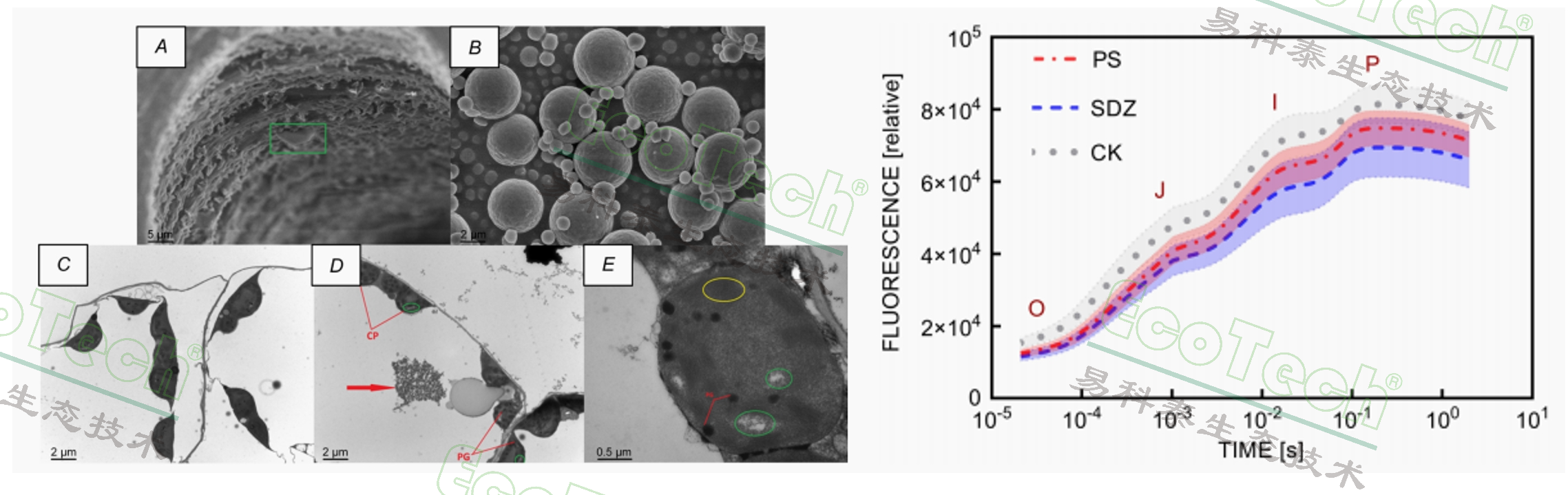 圖5. 左圖:掃描電鏡圖像(A,B):(A)菊花冠狀葉用聚苯乙烯處理;(B)聚苯乙烯顆粒。葉片的透射電鏡圖像(C-E):(C)CK;(D)SDZ;(E)PS。CP葉綠體PG質(zhì)體球體黃色圓類囊體腫脹綠色圓低密度區(qū)域綠色方形聚苯乙烯顆粒紅色箭頭SDZ簇。右圖:OJIP誘導(dǎo)物的誤差柱狀圖(PS-聚苯乙烯抑制組、SDZ-磺胺嘧啶應(yīng)激組、CK-空白對照組)。一片葉片只測量一次,每個處理使用10個不同的葉片重復(fù)10次。所有植物均在同一時間生長,且處于同一發(fā)育階段。