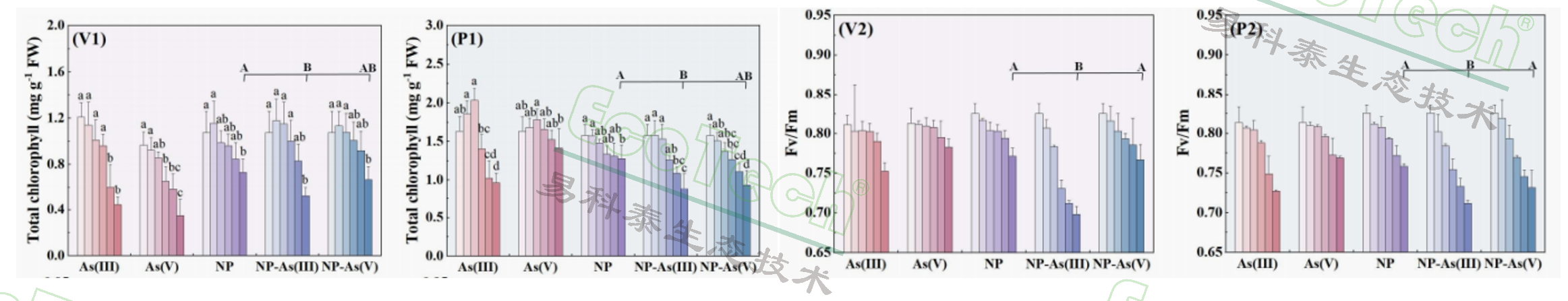 圖6. 上圖:金屬(As(III)和As(V)以及PS-NPs對苦草和菹草的葉綠素(V1、P1)、葉綠素?zé)晒猓╒2、P2)、可溶性糖(V3、P3)、可溶性蛋白(V4、P4)在14天內(nèi)的單一和聯(lián)合作用效果。