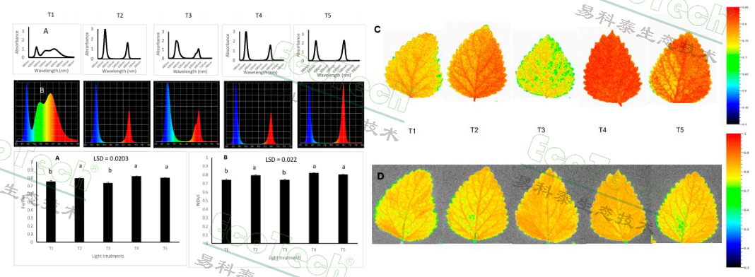 在藍(lán)藻、細(xì)菌和擬南芥的光合作用過程中,435納米處理對(duì)光系統(tǒng)I的激活效果更為明顯。這或許能解釋本研究中Fv/Fm和NDVI指標(biāo)的顯著提升。然而研究中生物量等分析結(jié)果表明,顯著的光合作用活性并未轉(zhuǎn)化為檸檬香蜂草生長速率的提升。這可能涉及多種因素,包括光照強(qiáng)度、溫度等實(shí)驗(yàn)條件的差異。針對(duì)該植物物種光合作用參數(shù)與生長特性之間矛盾的發(fā)現(xiàn),仍需開展更多研究以深入理解。