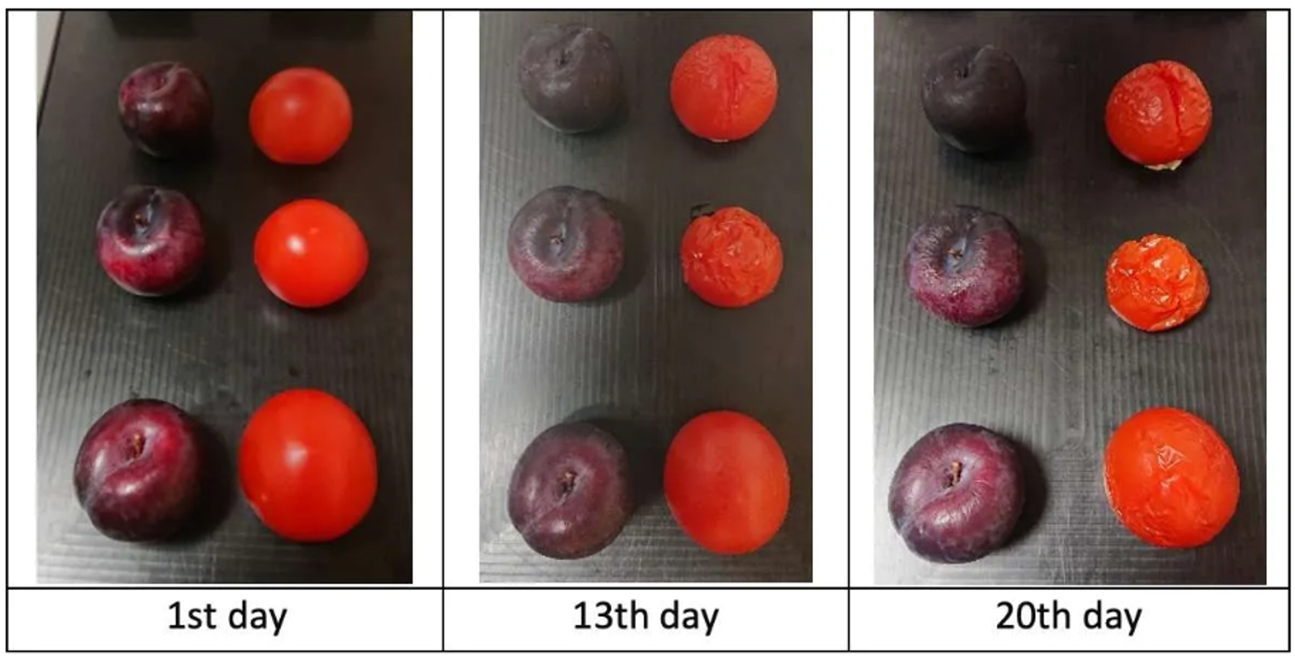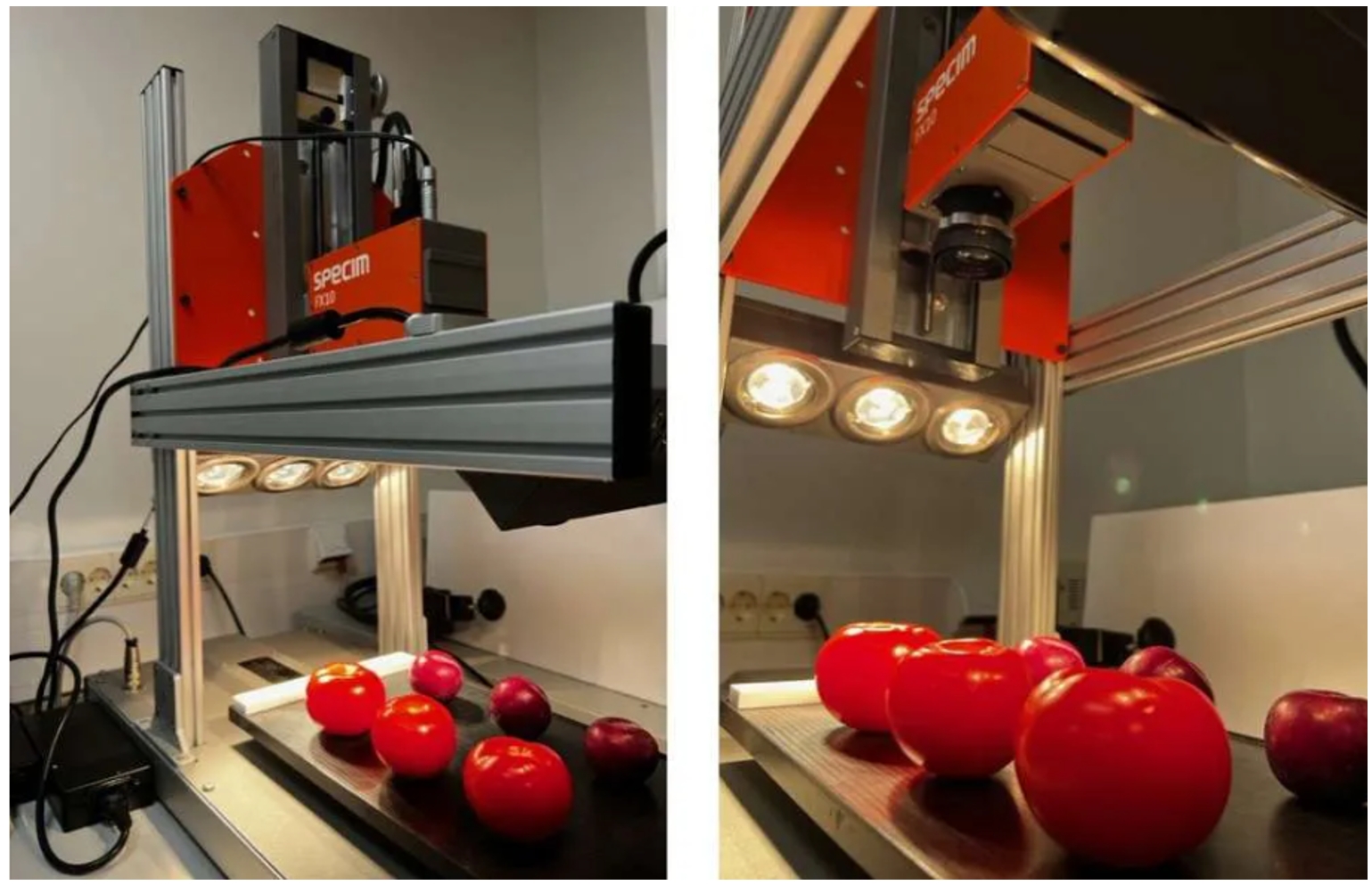 圖1:將三個(gè)李子和番茄樣本放置在實(shí)驗(yàn)室掃描儀上,并使用Specim FX10相機(jī)測量了20天
