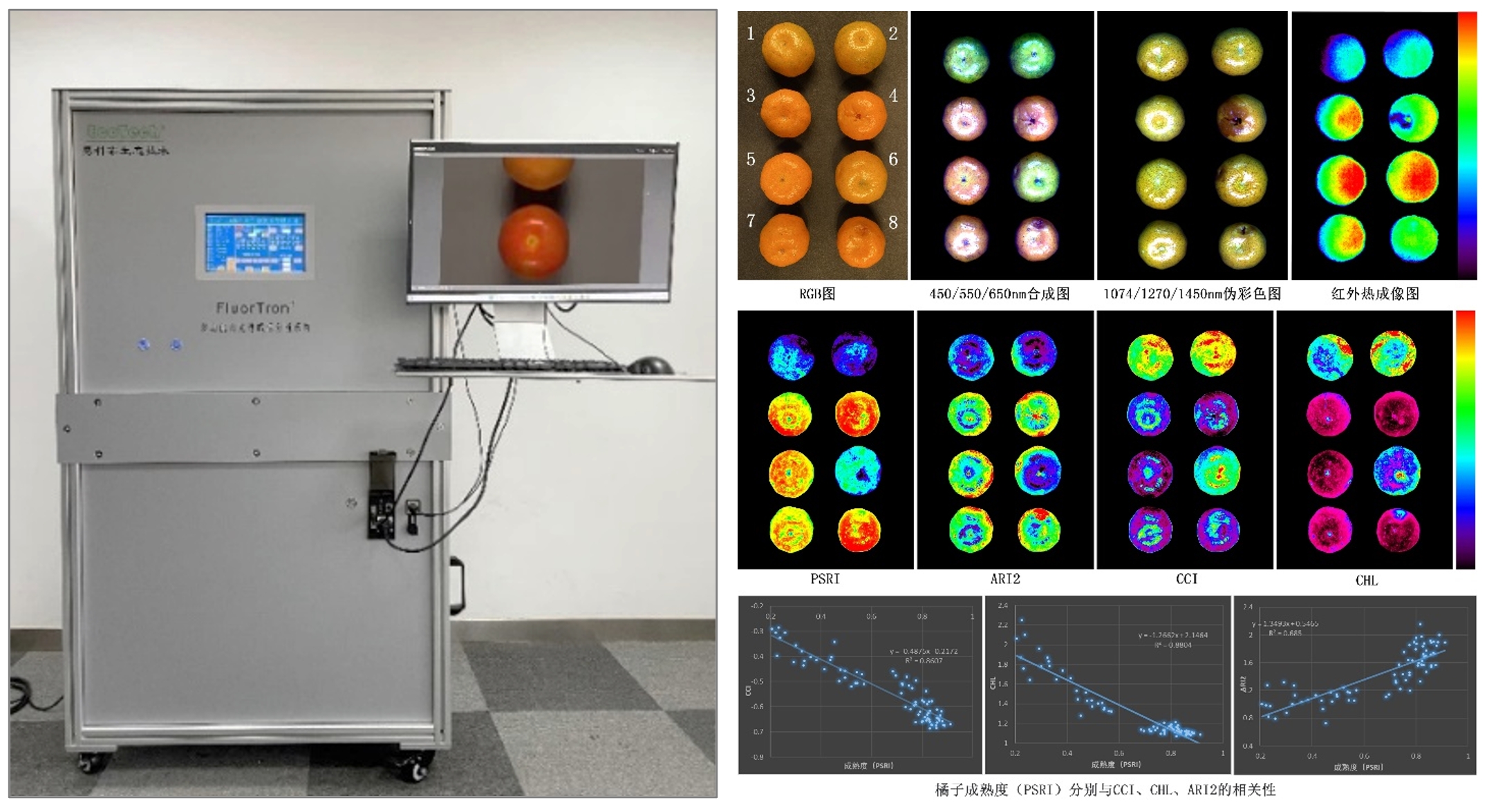 圖6:FluorTron?多功能高光譜成像分析系統(tǒng)及橘子成熟度及損傷區(qū)光譜成像檢測