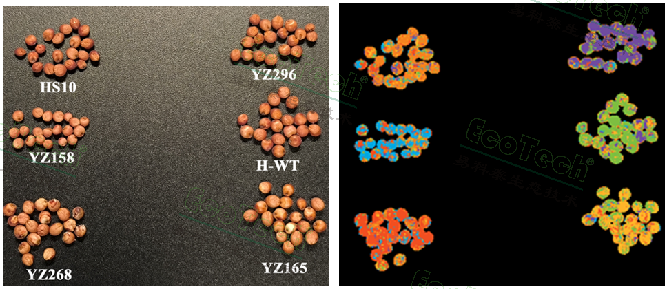 右圖:不同種質(zhì)藍(lán)綠熒光指數(shù)圖(EcoTech®實(shí)驗(yàn)室供圖)