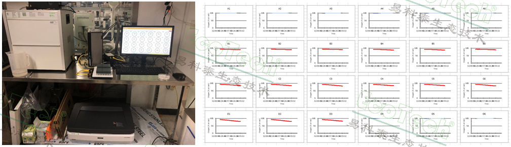 右圖:24通道的種子耗氧曲線(藍(lán)色曲線為空白對照,紅色曲線為不同處理的測試種子)