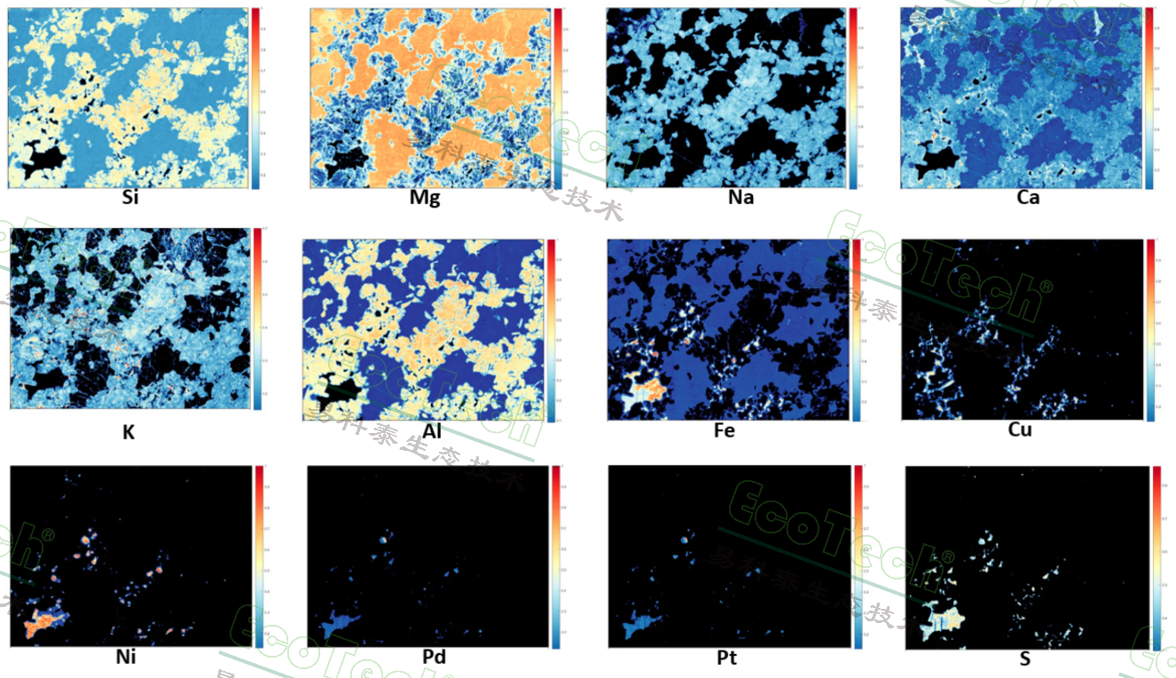 圖3. 礦石的Si, Mg, Na, Ca, K, Al, Fe, Cu, Ni, Pd, Pt, S元素分布成像